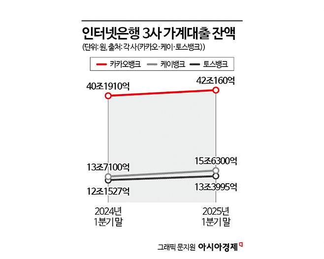 하반기에도 인터넷은행의 가계대출 성장은 쉽지 않아 보인다. 인터넷은행 특성상 가계 여신이 총여신의 대부분을 차지하고 있기 때문이다. 카카오뱅크의 경우 2024년 말 기준 총여신은 43조2022억원으로 이 중 주담대를 포함한 가계대출이 41조3076억원(95.6%)을 차지하고 있다. 케이뱅크 역시 2024년 말 기준 총여신(16조2670억원) 중 92.9%에 해당하는 15조1156억원이 가계대출이다. 토스뱅크는 아직 주담대 상품을 판매하고 있지 않으나 2024년 총여신 14조6271억원 중 13조1162억원(89.67%)이 신용대출 및 전·월세 보증금 대출 등이 포함된 가계대출이다.