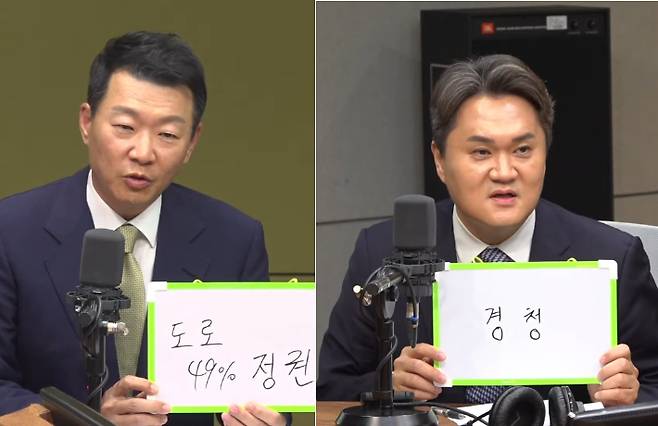 ◇ 박재홍> 경청. 이어서 우리 윤희석 대변인이 뭐라고 쓰셨는지, 도로 49% 정권. 이렇게 쓰셨습니다.