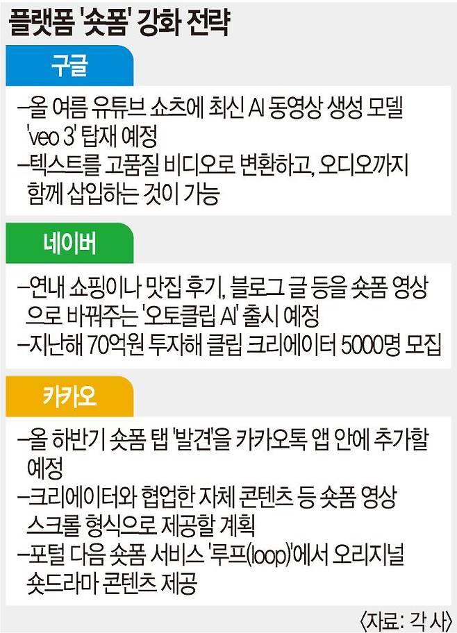 “숏폼을 잡아야 산다.” 시장의 대세로 자리잡은 숏폼 콘텐츠를 강화하기 위해 플랫폼이 분주하게 움직이고 있다. 최근 각종 소셜 미디어에서는 ‘유리과일 ASMR’ 영상이 이용자들의 숏폼 알고리즘을 장악한 모습이다. 이 영상은 구글의 최신 인공지능(AI) 영상 생성 모델 ‘비오3(Veo 3)’로 만든 것이다. 생생한 소리와 함께 유리 재질의 사물을 써는 모습을 감상할 수 있어 폭발적인 인기를 얻고 있다. 구글은 올 여름이 끝나기 전 유튜브 ‘쇼츠’에서 비오3 기능을 사용할 수 있게 할 계획이다. 네이버, 카카오 등 국내 플랫폼 역시 연내에 자체 숏폼 브랜드 강화를 마친다는 방침이다.