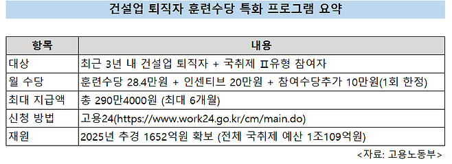 정부가 건설업 퇴직자 1만명을 대상으로 최대 6개월간 총 290만4000원을 지급하는 훈련수당 특화 프로그램을 8월부터 시행한다.