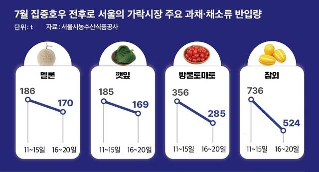 침수 피해는 시장 반입량 감소로 이어졌다. 집중호우가 시작된 16일부터 20일까지 5일간 서울 가락시장에 반입된 멜론은 170t이다. 그 직전 5일(11∼15일) 반입량이 186t인 것과 견주면 8.6% 줄었다.