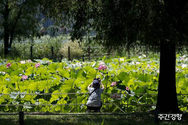 불볕더위가 연일 이어지던 지난 7월 11일 연꽃문화제가 열리고 있는 경기 양평군 세미원을 찾았다. 북한강과 남한강이 만나는 곳에 조성된 공원의 연못에는 만개한 연꽃들이 자태를 뽐내고 있었다.