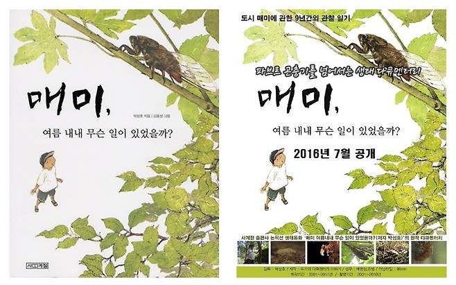 | ▲ '매미, 여름 내내 무슨 일이 있었을까' 생태동화 표지와 다큐멘터리 포스터 매미에 대한 관찰기록이 2004년 생태동화와 2016년 다큐멘터리 영화로 완성되었다 |