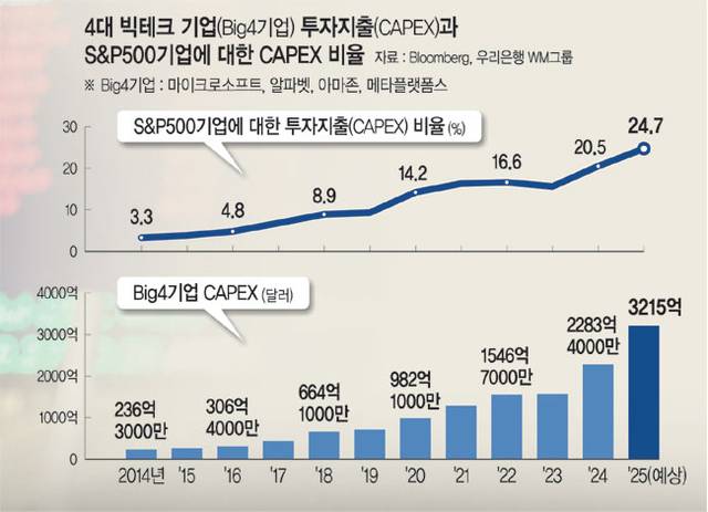 이들 4개 기업의 CAPEX는 지난해 전체 S&P500지수 편입 기업 CAPEX의 20.5%를 차지하며 10년 전보다 6배 이상 확대됐다. 올해는 이 비중이 25%에 육박할 것으로 보인다. 알파벳의 순다르 피차이 CEO는 “AI 투자에서 과소 투자 리스크가 과잉 투자보다 훨씬 크다”며 대규모 선제 투자의 필요성을 강조하기도 했다.