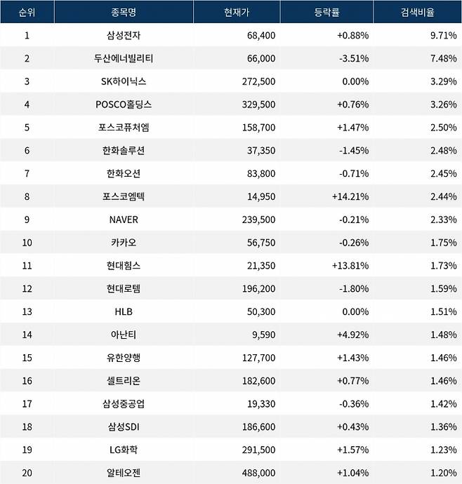 이어 두산에너빌리티(034020)가 검색비율 2위를 기록하며 3.51%의 하락세를 기록하고 있다. 검색비율 3위의 SK하이닉스(000660)는 0% 등락률로 보합세를 보이고 있다. 검색비율 4위 POSCO홀딩스(005490)는 개장 초반부터 0.76% 상승하며 순조롭게 출발하고 있다. 검색비율 5위 포스코퓨처엠(003670)은 1.47% 상승하며 강세를 보이고 있다.