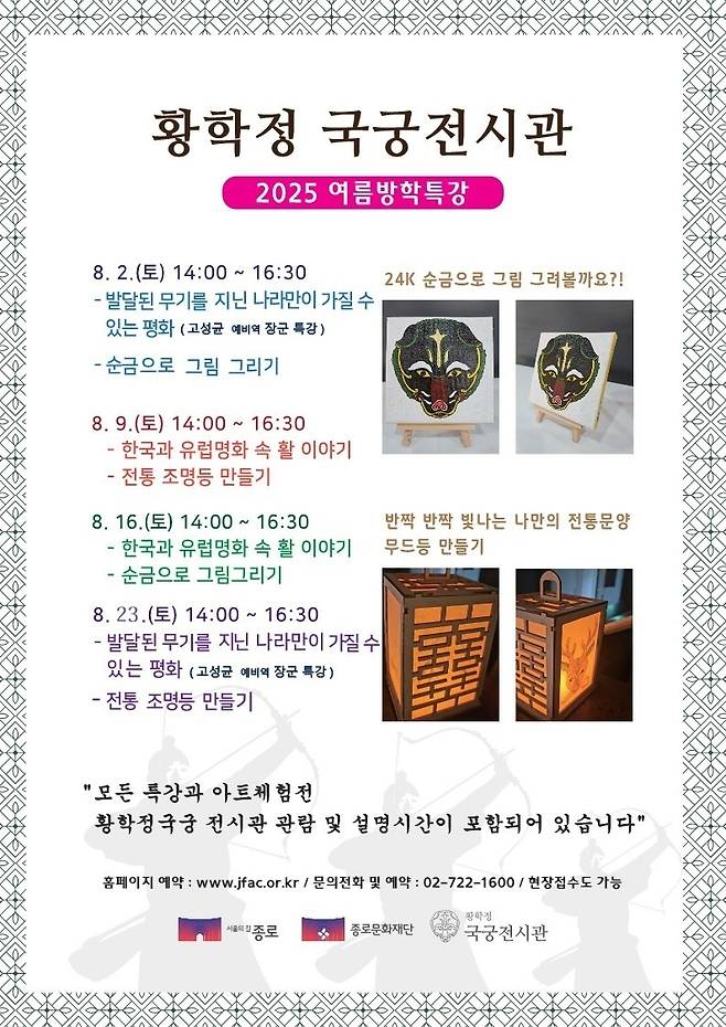 이번 방학특강은 서울시 종로구에서 지원하는 문화정책사업의 일환으로 종로문화재단에서 주관하고 황학정 국궁전시관에서 주최하는 기획 행사이다.