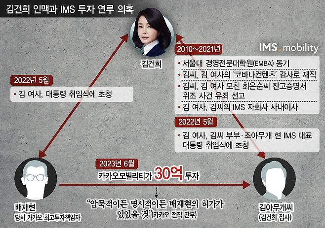 김건희씨의 최측근 집사로 불린 김아무개씨가 아이엠에스(IMS) 모빌리티의 대주주로 활동하고, 카카오모빌리티가 펀드를 통해 이 회사에 30억원을 투자했는데, 투자자 쪽에서 김건희씨와의 친분이 드러난 것은 이번이 처음이다.