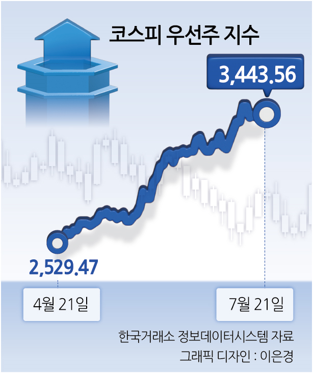 22일 한국거래소 정보데이터시스템에 따르면 삼성전자·현대차·미래에셋증권·두산 등 주요 우선주로 구성된 코스피 우선주 지수는 지난 3개월간 2529.47에서 3443.56으로 25.83% 상승했다. 코스피 상승률(29.92%)보다는 낮지만 증권가에서는 향후 상승 여력이 있다는 전망이 나온다.
