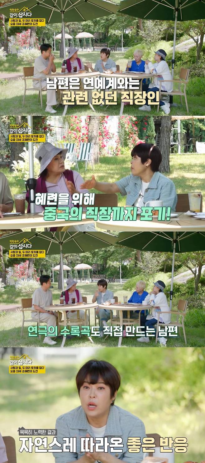 이를 들은 박원숙은 "진짜 이건 러브 스토리와 함께 성공 스토리다"라며 감탄했고, 조혜련은 "신랑이 중국에 있었다. 돌싱되고 나서 시간이 지났을 때 되게 외로웠다. 그때 제가 중국어를 배워서 중국에 왔다 갔다 하면서 만나게 됐다"라며 남편과의 러브스토리를 공개했다.