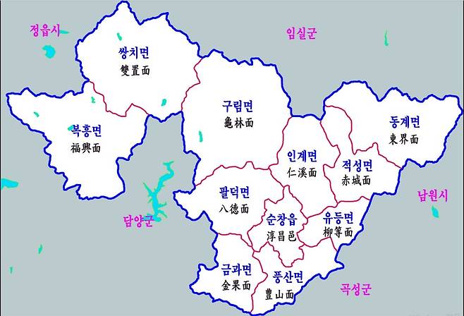 | ▲ 전북 순창군은 1개 읍(순창읍)과 10개 면으로 이뤄져 있다. 복흥면과 쌍치면 주민들의 생활권은 순창읍이 아니라 정읍시다. |
