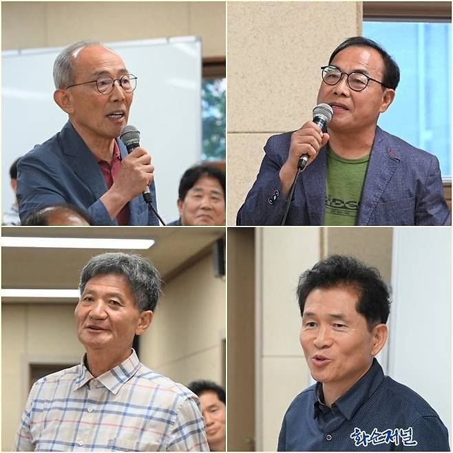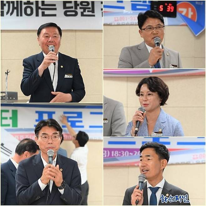 | ▲ (시계방향으로)오형열 화순군의회 의장, 류영길 부의장, 정연지 원내대표, 류종옥 운영위원장, 류기준 도의원이 인사말을 전하고 있다. |