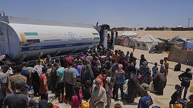 ▲ 지난 19일(현지시간) 가자지구 남부 칸유니스 구호소 물탱크 트럭 앞에 물을 받으려고 모인 팔레스타인 주민들