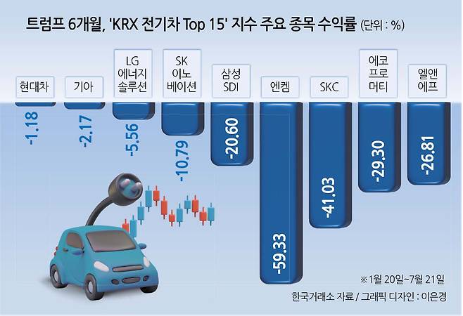 트럼프 대통령 취임 후 6개월간 코스피·코스닥 지수가 각각 27.23%(2523.55→3210.81)·13.39%(724.69→821.69)씩 오르는 등 역대급 급등 장세를 보이는 가운데 'KRX 전기차 톱 15' 지수는 '마이너스(-)' 수익률에 그치고 있다는 점이 전기차 관련 종목들의 부진을 더 두드러지게 하는 요소다.