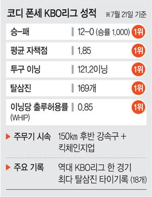 올 시즌 KBO리그에서 가장 강력한 투수를 꼽자면 단연 한화의 외국인 투수 코디 폰세(사진)다. 폰세는 올해 한화 유니폼을 입고 리그를 초토화하고 있다. 최고 시속 158㎞의 묵직한 직구와 변종 체인지업인 ‘킥체인지업’을 주무기로 앞세워 연일 완벽투를 이어가고 있다. 21일 기준, 다승(12승)·평균자책점(1.85)·탈삼진(169개)·승률(1.000)에서 리그 1위를 달리고 있다. 폰세는 올해 KBO리그 데뷔 첫해에 한 경기에서 18삼진(5월 17일·SSG전)을 잡아내 역대 KBO리그 최다 탈삼진 타이기록(1991년 선동열)도 작성했다.