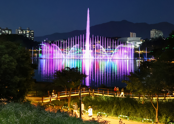 충주시는 호암지에 600여 개의 노즐과 300여 개의 LED 조명 등을 갖춘 총 길이 120m의 음악분수를 설치하고 운영에 들어갔습니다.