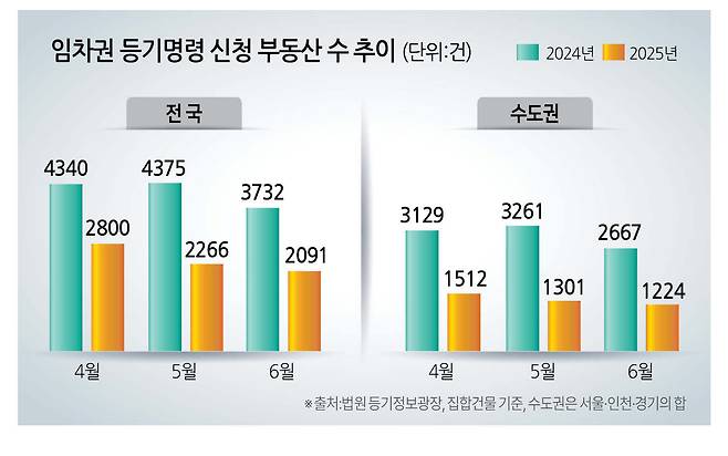 22일 법원 등기정보광장에 따르면 올해 1~6월 임차권등기명령 신청 부동산 수(전국, 집합건물 기준)은1만5255건으로 전년 동기(2만6027건) 대비 41.1% 감소했다. 특히 수도권의 해당 건수는 8858건으로 같은 기간 53.7% 감소해 전체 평균 대비 더 큰 폭으로 줄어들었다.