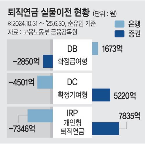 22일 금융권에 따르면 퇴직연금 자금이 증권사로 이동하는 흐름은 이미 뚜렷하다. 고용노동부와 금융감독원이 최근 발표한 ‘퇴직연금 실물이전 현황’에 따르면, 해당 제도가 도입된 2024년 10월부터 올해 6월 말까지 증권사로 유입된 자금은 2조5028억 원, 유출은 1조4823억 원으로 순유입액은 1조205억 원에 달했다. 반면 은행권은 1조174억 원의 순유출을 기록했다.