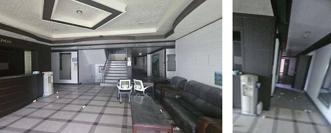 해당 건물의 내부 공간은 오랜 기간 사용되지 않아 전반적인 시설 노후화와 기능 저하가 심화된 상태입니다. 로비 및 복도 공간은 낡은 마감재와 단조로운 조명, 불규칙하게 방치된 가구 등으로 인해 고급 숙박시설로서의 이미지와는 거리가 먼 모습을 보이고 있습니다.