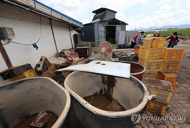 (예산=연합뉴스) 김준범 기자 = 22일 오전 충남 예산군 삽교읍 한 주택 마당에 호우 피해를 본 폐기물이 쌓여 있다. 2025.7.22