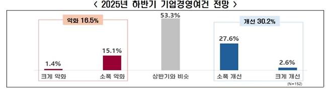한국경제인협회가 국내 매출 상위 1,000대 기업을 대상으로 실시한 '2025년 하반기 기업경영여건 조사'에 따르면, 응답 기업의 30.2%가 상반기보다 경영여건이 나아질 것으로 내다봤다. 같은 기간 악화될 것이라는 응답은 16.5%이며, 53.3%는 '큰 변화 없을 것'으로 답했다.