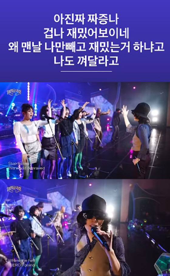 또한 이수현은 '라이브와이어' 무대에 오른 이찬혁의 모습과 함께 "분노하지 당연히. 맨날 자기 혼자서 재밌는 거 다하고 나는 꿀벌 옷 입으라고 하고"라며 분노했다. 이어 신나는 무대에 "나도 껴달라. 나도 춤 추겠다. 나도 껴달라. 제발"이라고 해 웃음을 자아냈다.