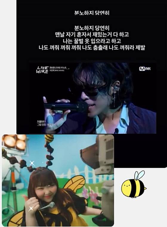 또한 이수현은 '라이브와이어' 무대에 오른 이찬혁의 모습과 함께 "분노하지 당연히. 맨날 자기 혼자서 재밌는 거 다하고 나는 꿀벌 옷 입으라고 하고"라며 분노했다.