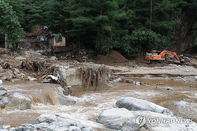 (가평=연합뉴스) 임병식 기자 = 22일 경기도 가평군 조종면 마일리에서 수해로 캠핑장과 연결된 다리가 유실되어 있다. 2025.7.22
