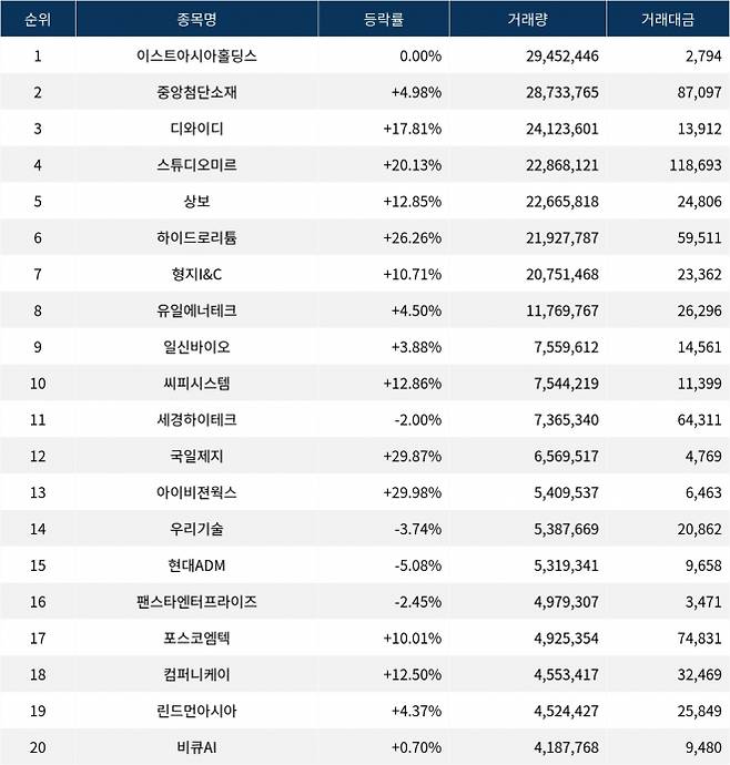 [서울데이터랩]금일 코스닥 거래량 1위 이스트아시아홀딩스 29만주 돌파