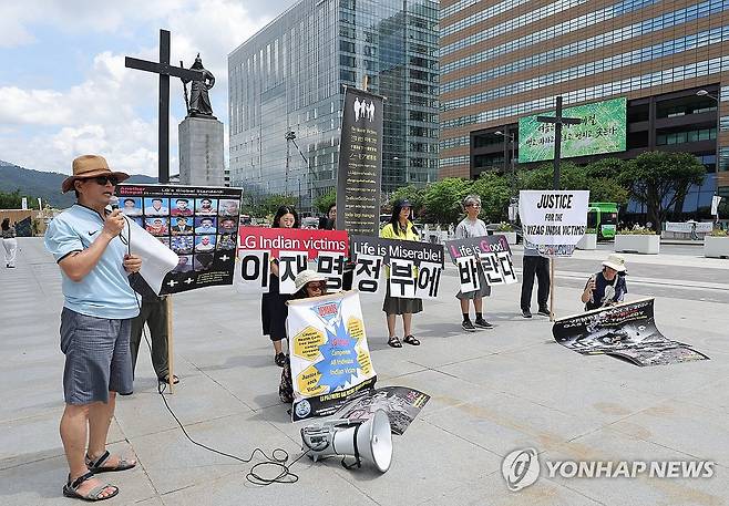 (서울=연합뉴스) 류영석 기자 = 22일 서울 광화문광장에서 환경보건시민센터 회원들이 'LG화학 인도참사 재발 방지 촉구 기자회견'을 하고 있다. 2025.7.22