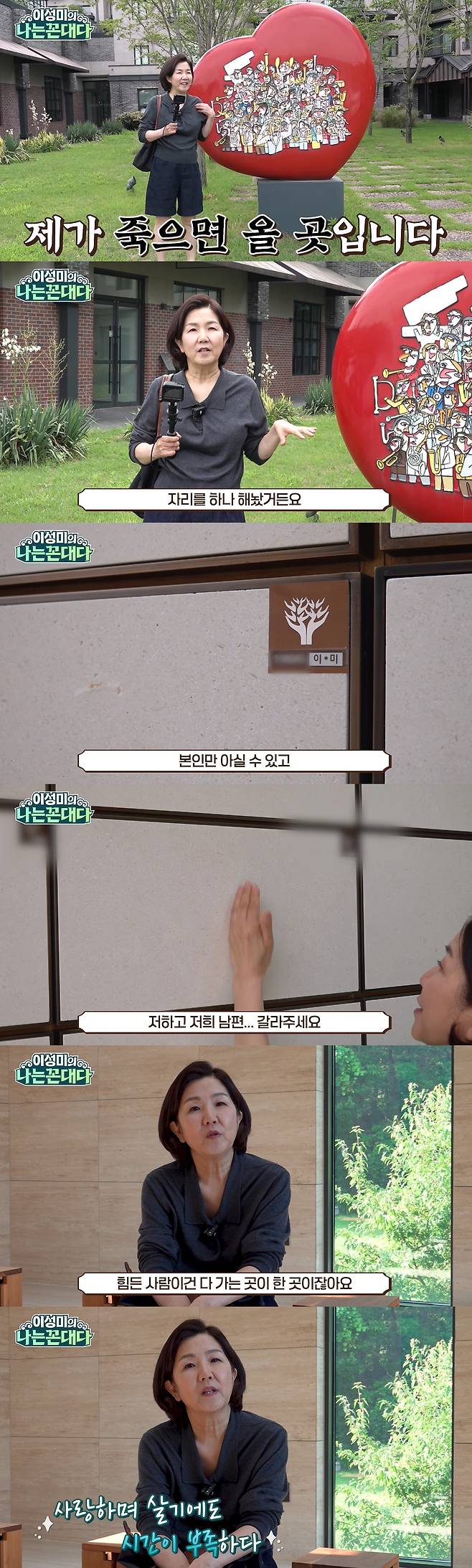 이성미는 "자연 속에서 여러분들을 만나게 돼서 너무 좋다. 여기는 제가 죽으면 올 곳이다. 오늘은 살아서 왔지만, 제가 납골당에 자리를 하나 해놨다. 내 죽음을 먼저 준비해 놓으면 아이들이 편할 거라고 생각했다"라며 한 납골당에서 말문을 열었다. 이어 "우리 집을 보여드리겠다. 평수는 얼마 안 되지만 남편과 같은 자리다. 남기고 싶은 말도 본인이 미리 예약해서 적어놓을 수 있다"라며 자신이 영면할 안치함도 공개했다.