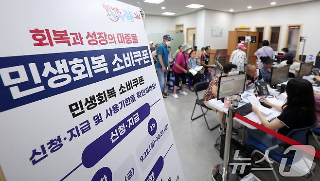 (서울=뉴스1) 김성진 기자 = 민생회복 소비쿠폰 1차 신청 둘째 날인 22일 서울 강동구 암사 1동 주민센터를 찾은 시민들이 소비쿠폰을 신청하고 있다.