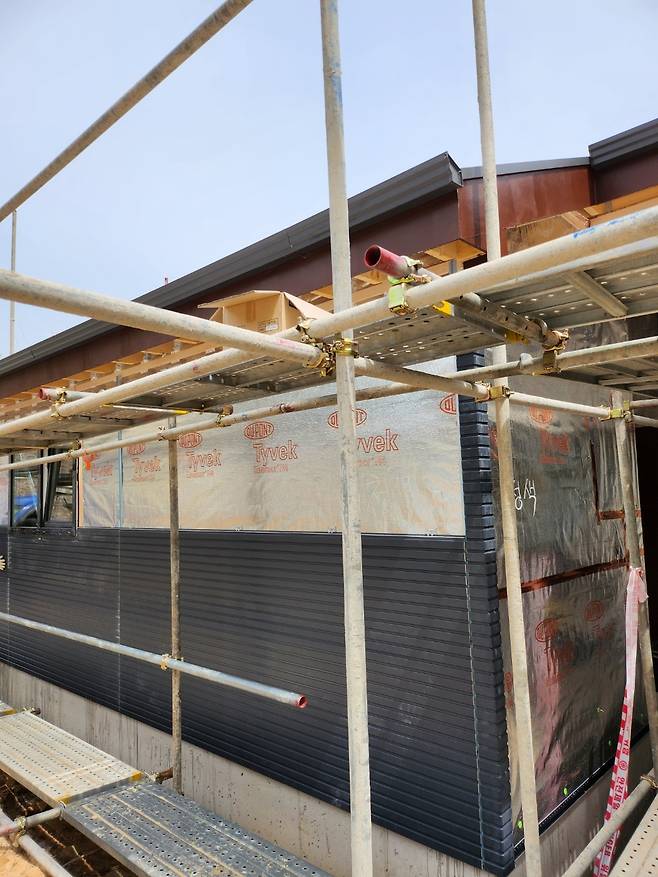 이후 나름의 정보 수집을 거쳐 38mm 각재로 벽체 공기 흐름층 역할을 하는 레인스크린과 하단 버그스크린 설치를 반영하기로 시공사 사장과 사전에 협의했다. '레인스크린'은 외장재와 구조체 사이에 틈을 만들어 비나 습기를 차단하는 배수·환기 시스템이고, '버그스크린'은 레인스크린 공간으로 벌레가 침투하는 것을 방지하는 방충막이다.