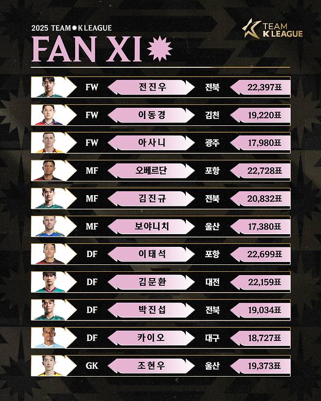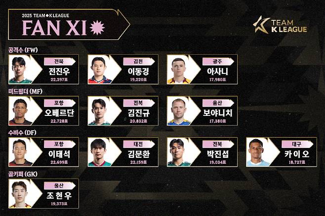 최다 득표자는 포항의 철인 오베르단이다. 오베르단은 총 2만2728표를 받아 전체 후보 44명 중 1위를 차지했다. 이태석(포항) 전진우(전북) 김문환(대전) 김진규(전북)가 그 뒤를 이었다. 공격수 부문에서는 12골로 K리그1 득점 선두에 올라있는 전진우(2만2397표)와 함께 이동경(김천·1만9220표), 아사니(광주·1만7980표)가 선발됐다. 미드필더 부문에서는 최다 득표자 오베르단과 함께 김진규(전북·2만832표), 보야니치(울산·1만7380표)가 이름을 올렸다. 수비수 부문에서는 대표팀에서 맹활약 중인 이태석(2만2699표)과 함께 김문환(2만2159표), 박진섭(전북·1만9034표), 카이오(대구·1만8727표)가 팬들의 선택을 받았다.
