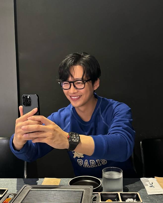 사진 속 세 사람은 테이블에 나란히 앉아 활짝 웃으며 각종 포즈를 취하고 있다. 테이블 위에는 구운 고기가 올려진 그릴과 다양한 반찬, 식기들이 정갈하게 차려져 있어 오랜만에 만남을 즐기는 이들의 따뜻한 분위기가 고스란히 전해진다.