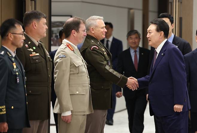| ▲ 2023년 8월 10일 당시 윤석열 대통령이 서울 용산 대통령실 청사에서 열린 유엔사 주요 직위자 초청 간담회에 입장하며 폴 러캐머 유엔군사령관과 악수하고 있다. |