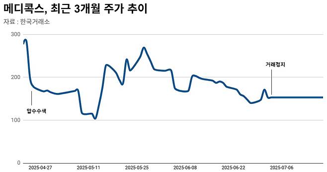 메디콕스 주식 거래가 정지되긴 했지만, 이번 거래 정지는 횡령·배임 사건이 불거지고 3개월 가까이 지난 시점이다. 검찰이 지난 4월 24일 메디콕스에 대한 압수수색 영장을 집행, 전직 경영진의 문제가 시장에 널리 알려졌다. 같은 날 메디콕스 주가는 하한가(일일 가격 제한 폭 최하단)를 찍었다.