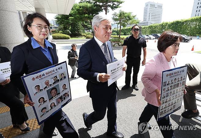 (서울=연합뉴스) 김성민 기자 = 조국혁신당 서왕진 원내대표(가운데)와 의원들이 22일 내란 특검 사무실이 있는 서울고등검찰청에서 엄정수사를 촉구하는 기자회견을 마치고 의견서를 전달하고 있다. 왼쪽부터 백선희 의원, 서 원내대표, 정춘생 의원. 2025.7.22