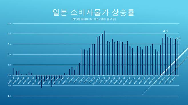 선거 이틀 전인 18일 일본 총무성이 발표한 ‘6월 소비자물가’는 전년동월대비 3.3% 올랐다. 1월의 4.0%에 비해 조금 낮아졌지만 디플레이션에 오래 시달려온 일본에선 초인플레라 할 만한 수치다. 일본의 연간 물가 상승률은 2022년 3.0%로 커진 뒤, 2023년 3.8%, 2024년 3.2%를 기록했고, 올해도 3%대 상승세가 이어지고 있다.