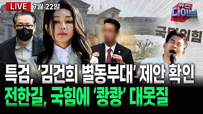 출연: 이병철 변호사, 오윤혜 방송인, 신인규 변호사, 박영식 평론가, 권태호 한겨레 논설실장, 진행: 고현준. ‘피의자 김건희 씨’ 소환 통보! 특검 노림수는? / 도망간 집사, 조사 중단 이종호, 소환 날짜 거부한 명태균 / 건진-통일교 ‘김건희 별동부대’ 논의 / “김건희·VIP 통해 집행유예”…이종호, 재판 청탁 정황 / 석연찮은 김용대 드작사령관 영장 기각! 도대체 왜? /2년 만에 ‘대통령 통화’ 실토…이종섭의 거짓말 / 전한길 입당 후폭풍! ‘친길 VS 반길’ 갈라진 국힘. 오늘 (7월 22일) 뉴스 다이브 많은 시청바랍니다. 제작: 뉴스영상부
