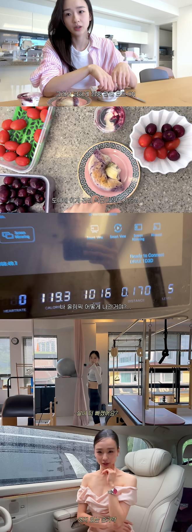 손연재는 토마토, 체리, 베이글 반쪽, 크림치즈로 식사를 하며 "최근 도쿄로 여행을 다녀왔는데 저녁을 네 번씩 먹었다. 짠 음식도 많이 먹었는데 그 다음주에 중요한 행사가 잡혔다. 급하게 일주일 관리를 하려고 한다"라고 이야기했다.
