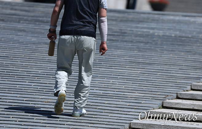 | ▲ 폭염 11일 오전 서울 용산구 대통령실 앞에서 집회를 마친 전국레미콘운송노조 노동자가 뜨거운 햇볕 아래 힘겨운 발걸음을 옮기고 있다. |