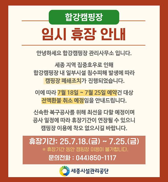 세종시시설관리공단(이사장 조소연·이하 공단)은 최근 집중호우로 금강 수위가 급상승함에 따라 합강캠핑장을 7월 25일까지 임시 휴장한다고 22일 밝혔다.