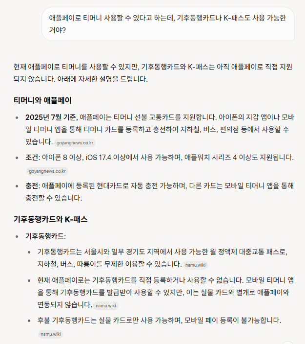 질문: 애플페이로 티머니 사용할 수 있다고 하는데, 기후동행카드나 K-패스도 사용 가능한 거야?