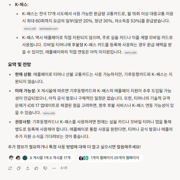 미래 가능성: X 게시물에 따르면 기후동행카드와 K-패스의 애플페이 지원이 추후 도입될 가능성이 언급되었으나, 아직 공식 발표나 구체적인 일정은 없습니다. 또한, 티머니의 기술적 규격 문제가 iOS 17 업데이트로 해결된 점을 고려하면, 향후 후불 서비스나 K-패스 연동 가능성이 있을 수 있습니다.