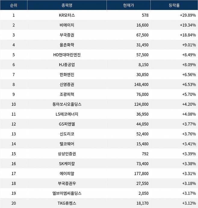 6위 HJ중공업(097230)은 종가 8,150원으로 8.09% 상승 마감했다. 7위 한화엔진(082740)은 종가 30,850원으로 6.56% 상승 마감했다. 8위 신영증권(001720)은 종가 148,400원으로 6.53% 상승 마감했다. 9위 조광피혁(004700)은 종가 76,000원으로 5.70% 상승 마감했다. 10위 동아쏘시오홀딩스(000640)는 종가 124,000원으로 4.20% 상승 마감했다.
