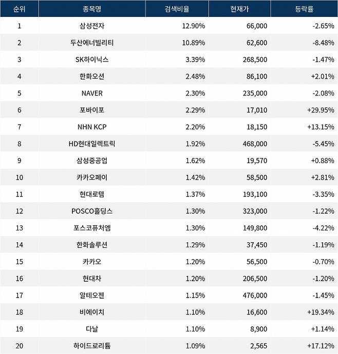 이어 검색비율 2위의 두산에너빌리티(034020)는 하락률 8.48%로 하락 마감했다. 검색비율 3위의 SK하이닉스(000660)는 1.47% 하락 마감했다. 검색비율 4위 한화오션(042660)은 상승률 2.01%로 상승 마감했다. 검색비율 5위 NAVER(035420)는 2.08% 하락했다.