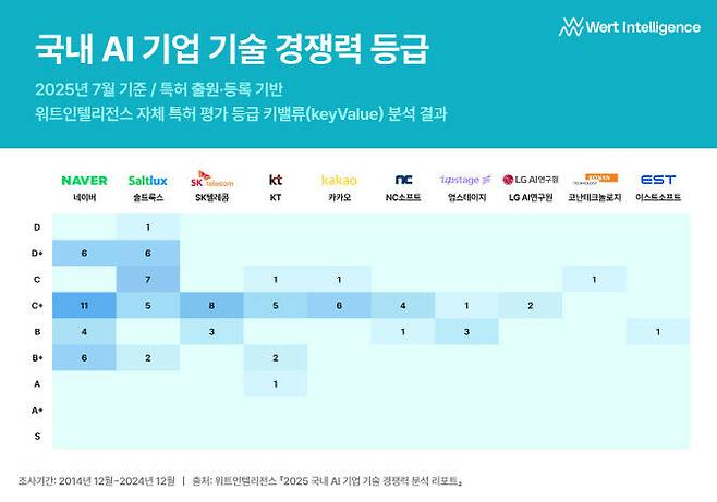 한편, AI 전문 기업 워트인텔리전스가 발표한 ‘2025 국내 AI 기업 기술 경쟁력 분석 리포트’에 따르면, 솔트룩스는 최근 10년간 AI 관련 특허 출원·등록 건수 기준으로 네이버, LG AI연구원, SKT에 이어 5위를 기록했으며, 중견 AI 기업 중에서는 상위권에 올랐다.