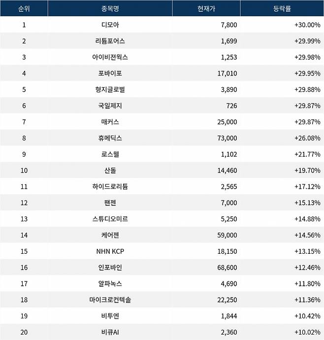 [서울데이터랩]디모아 30.00% 상한가…금일 증시 상승률 1위로 마감