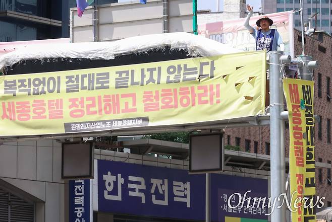 | ▲ 고진수 세종호텔 지부장이 22일 오전 서울 세종호텔 앞 도로 교통 시설물 위에서 정리해고 철회를 요구하며 160일째 고공농성을 진행하고 있다. |