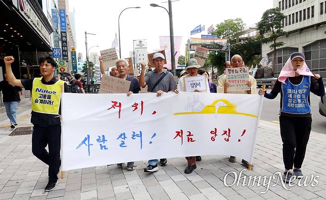 | ▲ 사회 각계 원로들이 22일 오전 서울 중구 세종호텔 고공농성장 앞에서 긴급 기자회견을 열고 세종호텔과 한국옵티칼 해고노동자들의 장기 고공농성 사태 해결을 정부에 촉구했다. |